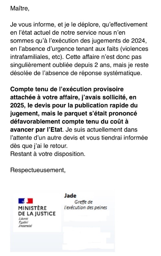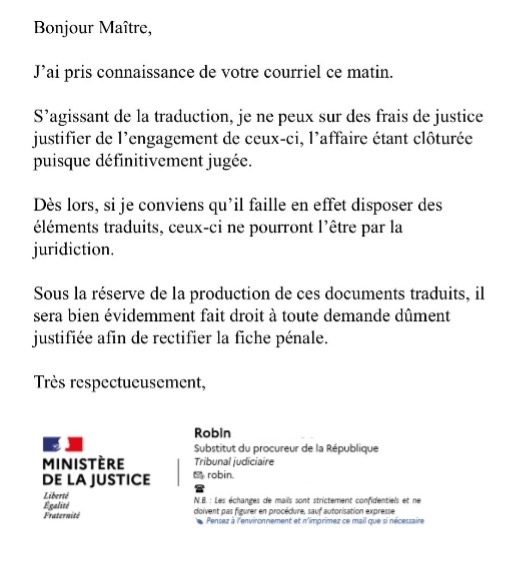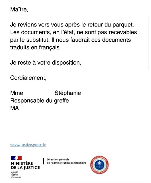 Pour information, la famille a fait établir deux devis par des traducteurs assermentés qui s’élèvent à une somme minimale de 500€ HT. On imagine mal comment elle pourrait leur transmettre des pièces d’une procédure pénale, certes définitive mais impliquant des individus très récemment condamnés.